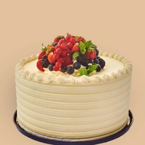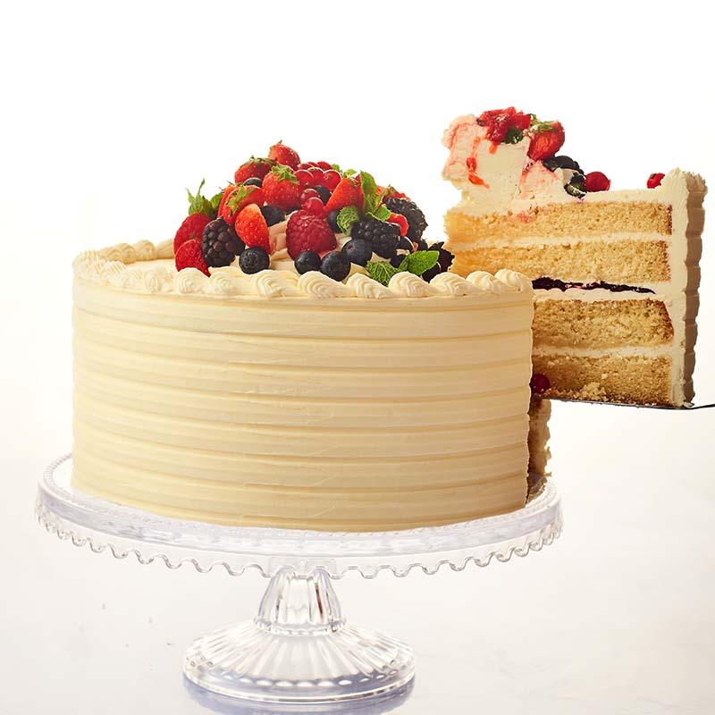 An airy vanilla cake layered with fluffy Chantilly buttercream, paired with a delightful mixed berry jam featuring blueberry, strawberry, blackberry and raspberry.