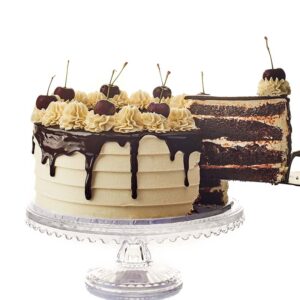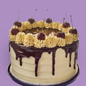 A luxurious blend of chocolate, cherries, and cream, topped with a delicate layer of white icing.