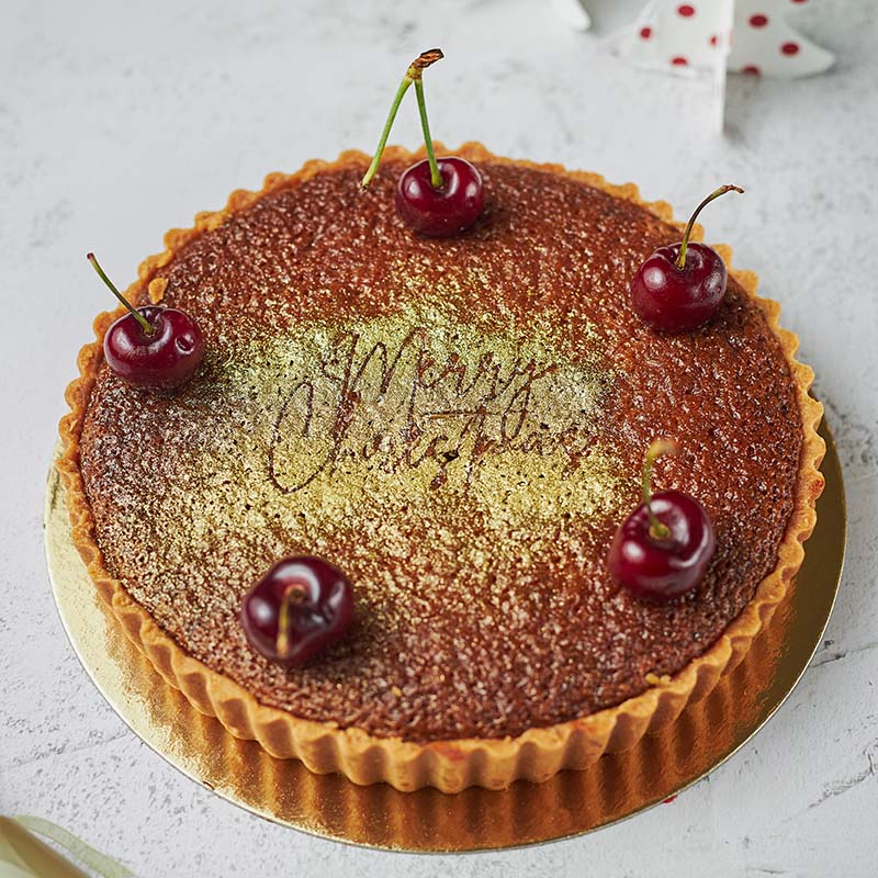 Buttery tart base with sweet cherries and nutty almond filling.