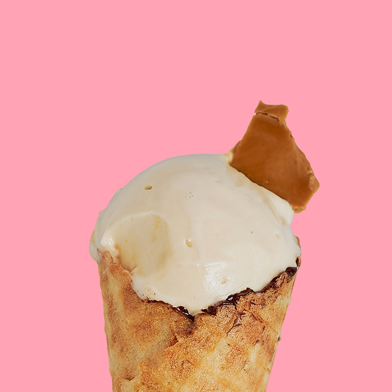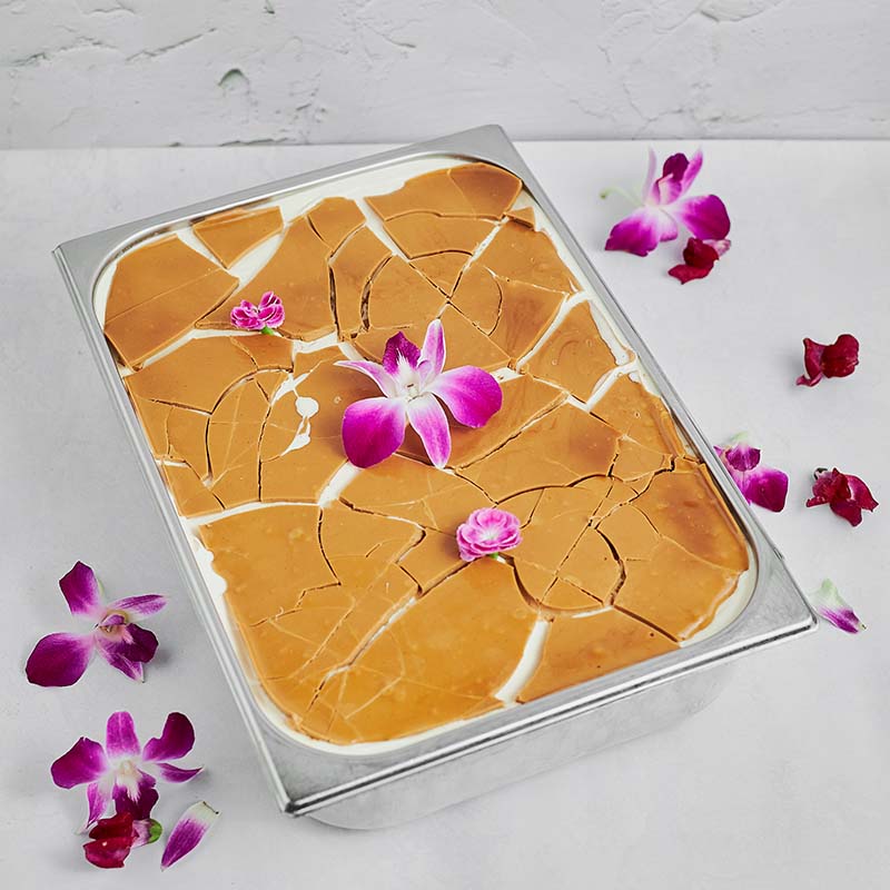 Vanilla custard gelato topped with a delicate layer of crunchy caramel, capturing the classic crème brûlée experience in every scoop.
