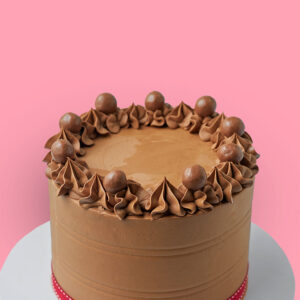 A chocolate-malt sponge cake filled with creamy malt buttercream and topped with crunchy Maltesers spread.