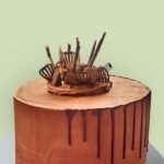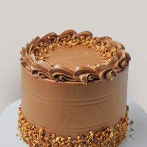 A decadent chocolate cake filled with creamy hazelnut buttercream, walnut spread, and rich chocolate cream, featuring notes of hazelnut, almond, macadamia, and peanuts in a chocolate syrup swirl for the ultimate nutty indulgence.