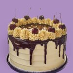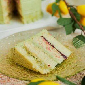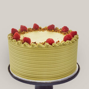 Delicate vanilla sponge with a pistachio crunch base, layered with creamy pistachio buttercream and sweet raspberry jam, all wrapped in a luscious pistachio frosting.