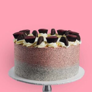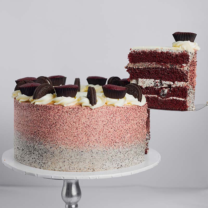 A classic red velvet cake with a creamy Oreo filling in the middle, blending the timeless richness of red velvet with a delightful cookie crunch.