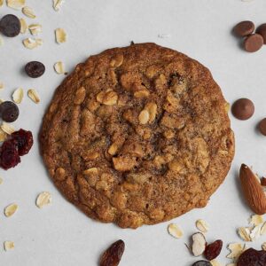 Packed with almond nuts, oatmeal, dark and milk chocolate, cranberries, and raisins, this cookie brings the crunch and chew in every single bite.