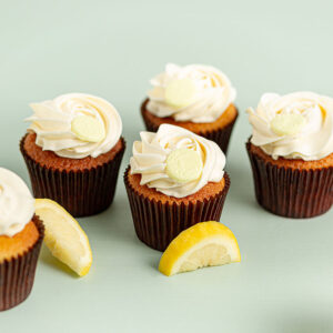 Our vanilla cupcake, topped with zesty lemon icing and a slice of lemon—a sunny burst of flavour.
