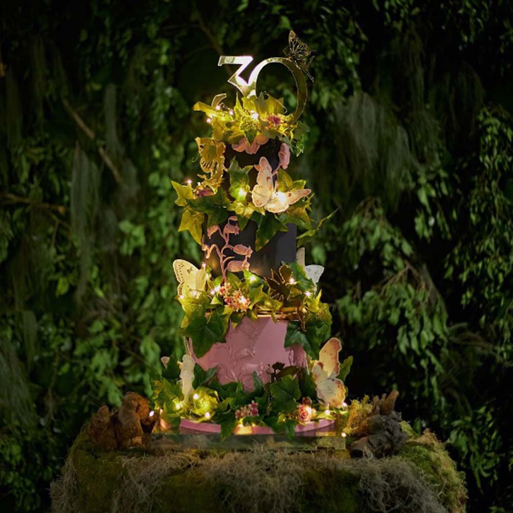 On the right: The main event—a fully edible birthday cake. A soft pink base layer stacked beneath two black tiers, detailed with sugar flowers, faux leaves, wafer paper butterflies, and gold mirror-cut fairies. Topped with a golden mirror-cut “30” to match the celebrant’s age, and elevated on a clear stand glowing with fairy lights—it was magical from every angle.