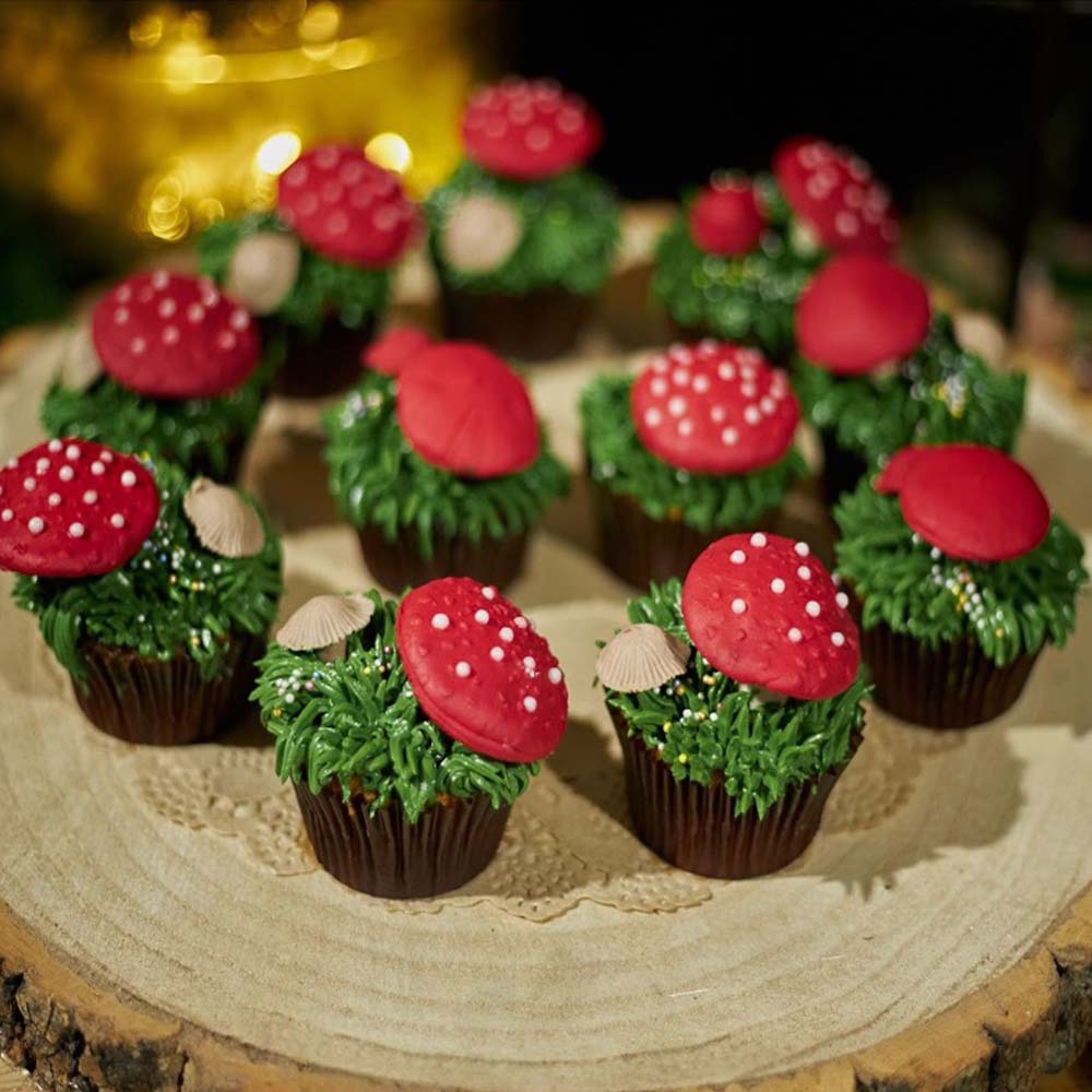 Mushroom cupcakes—covered in red and green chocolate butter cream and topped with fondant mushrooms